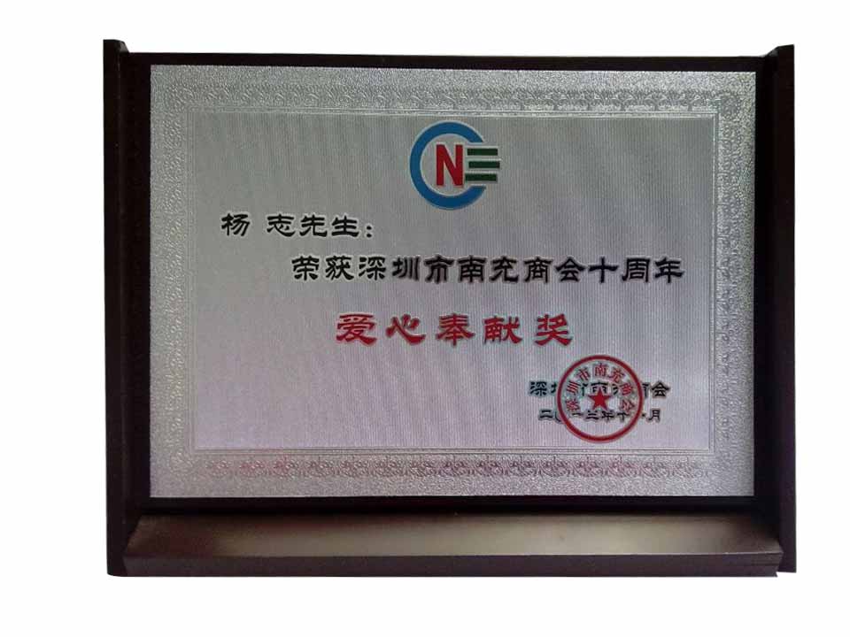 ![]() | 榮獲深圳市南充商會十周年愛心奉獻獎 頒發單位:深圳市南充商會 獲獎級別:公司榮譽 獲獎時間:2013年11月02日 |